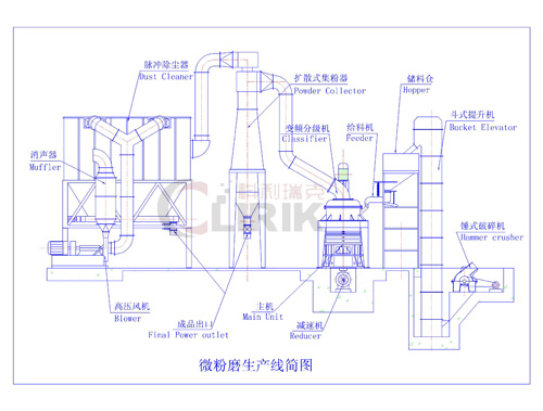 選粉機內(nèi)旋轉的葉輪使粗石膏粉回落重磨,符合要求的細粉則隨氣流進入旋風集粉器并由其下部的卸料閥排出即為終的石膏超細粉,而帶有少量細粉塵的氣流則經(jīng)過脈沖除塵器凈化后通過風機和消聲器排出。